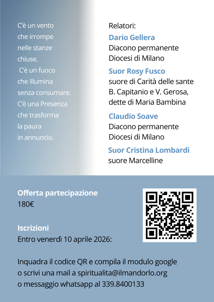 Per iscriverti compila il modulo google: https://forms.gle/FKwkJTnag8ca3aAM6 o scrivi una mail a spiritualita@ilmandorlo.org o messaggio whatsapp al 339.8400133